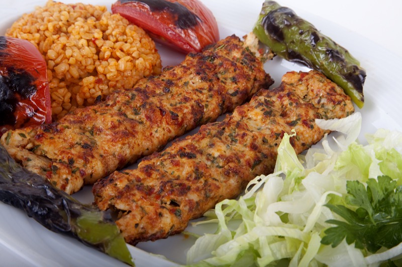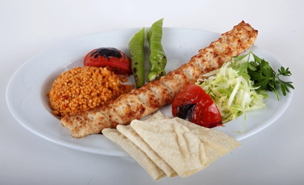 Özel kıyılmış tavuk eti, Pilav, Közde domates, Biber